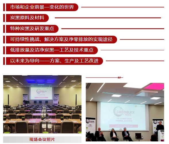 2024年5月14日至15日,2024年度炭黑世界大会在奥地利维也纳成功举行。与会人员围绕“净零排放”理念下炭黑行业所面临的机遇与挑战、节能减排成功案例、行业上下游企业加强合作等话题展开讨论。